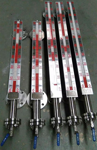 液位計根據(jù)浮力原理,浮子在測量管內(nèi)隨液位的升降而上下移動,浮子內(nèi)的永久磁鋼通過磁耦合作用,驅(qū)動紅、白色翻柱翻轉(zhuǎn)180’液位上升時,翻柱由白色轉(zhuǎn)為紅色,下降時,翻柱由紅色轉(zhuǎn)為白色,從而實現(xiàn)液位的指示。