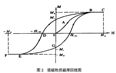 磁開(kāi)關(guān)內(nèi)部裝有鐵質(zhì)的彈性簧片,在低頻磁場(chǎng)中,鐵質(zhì)簧片被磁化,從而使彈性簧片吸合導(dǎo)通,而油位計(jì)內(nèi)部磁翻板未達(dá)到磁開(kāi)關(guān)動(dòng)作值的位置,所以監(jiān)控誤報(bào)油位異常信號(hào)。當(dāng)機(jī)組停機(jī)時(shí),勵(lì)磁電纜中電流消失,但此時(shí)磁開(kāi)關(guān)誤動(dòng)作信號(hào)并未復(fù)歸,下面將通過(guò)磁滯回線的概念來(lái)解釋此現(xiàn)象。