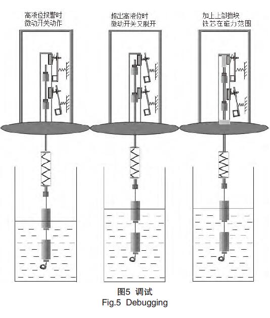 3)在調(diào)試過(guò)程中,發(fā)現(xiàn)液位開關(guān)沒有自保持功能,當(dāng)高報(bào)警點(diǎn)過(guò)后,液位再往上升則高液位報(bào)警會(huì)消除,低液位時(shí)也是同樣,在分析原因后發(fā)現(xiàn),鐵芯在套筒內(nèi)移動(dòng)的位置不當(dāng)是造成不能自保持的原因,如圖5所示,于是在套筒內(nèi)的鐵芯上方加一阻擋塊,使高液位超出時(shí),鐵芯被阻擋塊擋住,不再向上移動(dòng),從而不會(huì)脫出微動(dòng)開關(guān)的磁力范圍,對(duì)低液位報(bào)警的自保持是在鐵芯的下部加一個(gè)環(huán)型的墊片,阻止鐵芯向下移動(dòng)超出微動(dòng)開關(guān)的磁力范圍。從而提高了可靠性和重復(fù)性。接下來(lái)的調(diào)試中,又出現(xiàn)了一些零零碎碎的問(wèn)題,如磁鐵磁性不夠,或者彈簧彈性不夠,彈簧的抗疲勞性差。元器件的材料和加工工藝不理想,出于對(duì)核電的安全性和穩(wěn)定性的考慮,開始考慮使用國(guó)外公司的產(chǎn)品,在試用后沒有出現(xiàn)以上的問(wèn)題,于是決定從新采購(gòu)一批國(guó)外的液位開關(guān),將有問(wèn)題的液位開關(guān)更換成國(guó)外的產(chǎn)品。