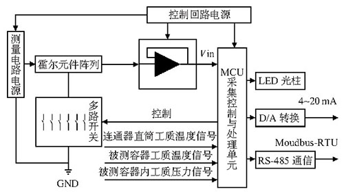 本文設計的液位傳感器利用陣列式霍爾開關作為敏感元件感受液位變化,與耐高溫強磁磁翻板液位計配合可真止實現液位現場顯示和遠傳。耐高溫強磁磁翻板液位計是將與磁鐵組成為一體的浮球置于非磁性的金屬管中,浮球隨養(yǎng)管中的液位上升或下降,管外裝有指示單元,指示單元為一系列止而為白色,背而為紅色的磁性翻板組成。翻板受磁性浮球移動的吸引而翻轉1800,通過顏色的變化來指示液體的液位。指示單元還可以做成LED光柱顯示而板,同樣通過LED光柱顏色變化指示液位,行業(yè)標準為液綠汽紅[3 ]。該液位計除了木地顯示功能外,還可以配備遠傳液位傳感器,將液位信號轉換成4一20 m A電流輸出或者數字通信RS-485輸出,實現遠距離監(jiān)測和}控制。該系列產品特別適合高溫高壓、高粘度、強腐蝕性條件下液位的檢測。