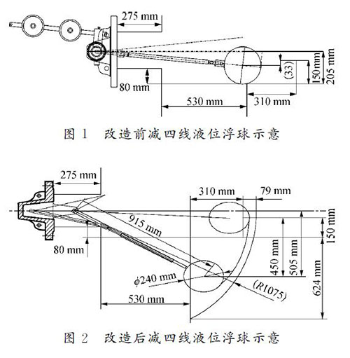 針對減四線液位測量進(jìn)行大轉(zhuǎn)角、切割集油箱改造,有效量程大于設(shè)計量程的80%,其改造測繪圖如圖2所示。改造后,安裝支架120 mm,插入深度為1 155mm,實(shí)際測量液位達(dá)450mm,儀表接液部位全部選用317材質(zhì)。轉(zhuǎn)軸—杠桿套筒、杠桿套筒—連桿、浮球—連桿的固定連接節(jié)點(diǎn)及加工焊接坡口增加焊接強(qiáng)度;對于活動節(jié)點(diǎn),采用專用銷子固定。