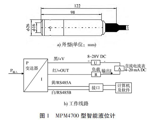頂裝型磁翻板液位計(jì)以微處理器為核心單元,具有檢測、判斷和信息處理功能。其測量水位的基本原理是利用半導(dǎo)體硅材料的壓阻效應(yīng),實(shí)現(xiàn)液位壓力與電信號的轉(zhuǎn)換[2]。即把與液體深度成正比的液體靜壓力,通過液位計(jì)( 變送器) 轉(zhuǎn)換成電流信號輸出,從而建立輸出電信號與液體深度的線性對應(yīng)關(guān)系,實(shí)現(xiàn)對液位( 水位) 的測量。沉箱水位監(jiān)測選用MPM4700 型頂裝型磁翻板液位計(jì),該液位計(jì)以擴(kuò)散硅壓阻式傳感器為管芯,集成變換器電路、微處理芯片為一體,其性能穩(wěn)定,結(jié)構(gòu)緊湊,外圍線路簡單。該液位計(jì)為四線制,可同時(shí)輸出一組4 ~ 20 mA 的標(biāo)準(zhǔn)電流信號和RS486 數(shù)字信號。MPM4700 型智能