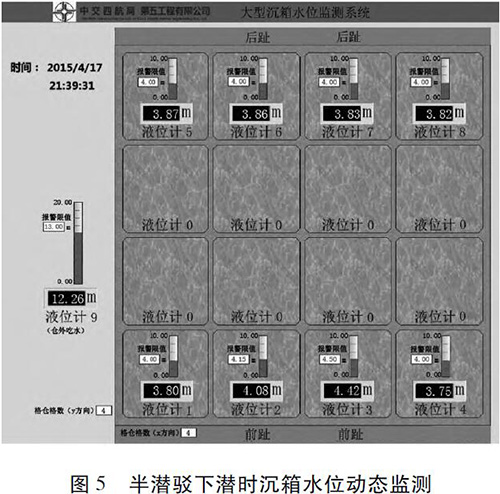漳州后石港區(qū)3 號泊位碼頭工程采用重力式沉箱結(jié)構(gòu),該工程沉箱共15 件,單件質(zhì)量4 365 t,沉箱長、寬、高分別為19. 8、21. 9 、25. 0 m; 沉箱分7 層澆筑,澆筑*頂層時(shí)3# 格倉按設(shè)計(jì)圖紙預(yù)留3 m 高的缺口。在漳州預(yù)制廠預(yù)制,沉箱安裝施工現(xiàn)場距離預(yù)制廠約6. 3 km。沉箱采用氣囊橫移至出運(yùn)通道,再縱移至出運(yùn)碼頭前沿線上駁,采用8 000 t 半潛駁下潛安裝。根據(jù)浮游穩(wěn)定計(jì)算,沉箱各格倉壓載水見圖4。2#、6# 格倉為3. 98 m,3#、7#格倉為4. 34 m,其余格倉為3. 80 m,沉箱倉外吃水12. 15 m。根據(jù)當(dāng)?shù)厮恼境毕恚?015-04-17T20∶30 下潛坑潮位條件符合下潛要求,半潛駁在下潛區(qū)開始加水下潛; 下潛至沉箱吃水1. 8 m 時(shí),同時(shí)開啟沉箱的8 個(gè)注水閥門開始向沉箱格倉中注入壓載水; 當(dāng)沉箱吃水5 m 時(shí)半潛駁暫停下潛,起重船靠近半潛駁,工人將連接起重船吊鉤的鋼絲繩用卡環(huán)固定在沉箱頂部吊環(huán)上。半潛駁繼續(xù)下潛至9 m 時(shí)再暫停下潛,等待吊纜就位。半潛駁繼續(xù)下潛,在沉箱底與枕木支墊處于脫離的臨界狀態(tài)時(shí),減緩半潛駁下潛速度,直至沉箱完全脫離浮船塢。此時(shí)啟動吊機(jī),使鋼絲繩處于輕微受力狀態(tài)。在半潛駁下潛及沉箱格倉注入壓載水過程中,通過大型沉箱水位監(jiān)測系統(tǒng)能夠動態(tài)顯示各格倉水位值及沉箱的吃水深度( 圖5)