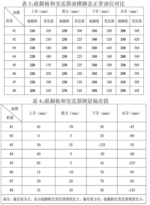 3)通過(guò)表3、表4,可以看出磁翻板耐酸堿磁翻板液位計(jì)廠家油位和變送器油位測(cè)值存在偏差,導(dǎo)致變送器油位測(cè)值不能直接反映油槽實(shí)際油位的高低,需要結(jié)合磁翻板和變送器的偏差值才能得出油槽實(shí)際油位,故建議下個(gè)檢修期時(shí)重新修正油位變送器的量程,使靜態(tài)下變送器油位測(cè)值與磁翻板油位保持一致,運(yùn)行時(shí)能夠直接反映油槽實(shí)際油位的高低;