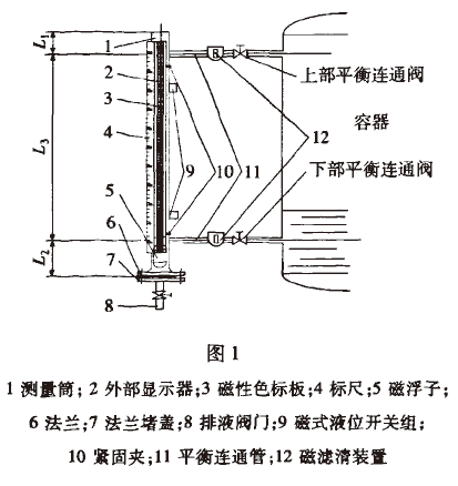 1測(cè)量筒;2外部顯示器;3磁性色標(biāo)板;4標(biāo)尺;5磁浮子;6法蘭:7法蘭堵盞;8排液閥門;9磁式液位開關(guān)組;10緊固夾;11平衡連通管;12磁濾清裝置元件上磁性材料的作用而發(fā)生翻轉(zhuǎn)。翻板或翻柱上涂有兩種視覺(jué)區(qū)分較大的顏色,觀看液位顯示器中翻板或翻柱的顏色分界線就可知容器中液位的情況。測(cè)量筒垂直方向的上下兩端安裝有閥門,其中上閥門用于平衡氣壓,下閥門用于放走殘留液體。
