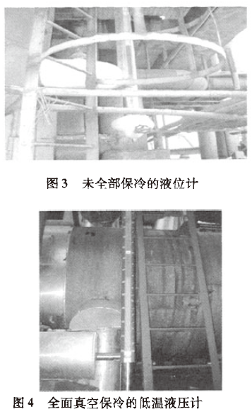 從圖3和圖4可見,平衡連通管無(wú)真空保溫層的液位計(jì),有冷凝冰塊出現(xiàn)。加了之后,冷凝冰塊全部消失。