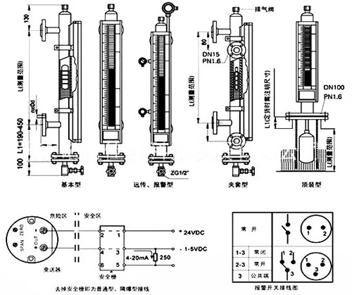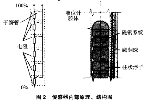 傳感器的作用是采樣液位高低位置并轉換成標準信號傳送至控制室,傳感器實際由干簧管和電阻組成。當浮子內磁鋼位置變化后,磁場通過器壁帶動傳感器內干簧管觸點吸合。干簧管吸合的位置決定回路的阻抗大小,干簧管的通常位置為10mm1組?;芈返拇笮≌门c液位的高低成正比,這樣*后由置于傳感器外殼內的變送器將電阻信號轉換成標準的電流信號,送至控制室。具體結構、原理圖見圖2。