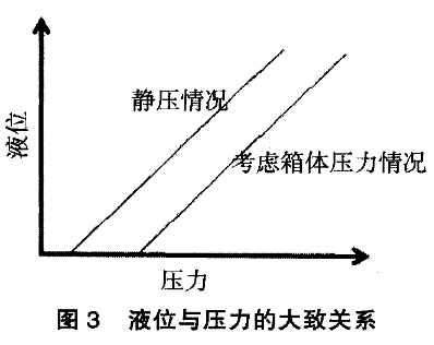 針對設備的故障,技術人員采取了更換多種質量好的磁感應開關(如耐高溫型等),以及基于磁翻板的外貼式模擬量液位控制,但效果均不理想。其他液位測量(如超聲波等)造價較高,而且需要對設備進行相應的改造,并且停運一段時間,而該系統(tǒng)屬于公用,上述條件均無法滿足。既要實現(xiàn)自動控制,又要相應允許實施。技術人員再次結合系統(tǒng)圖進行了分析:該水位溢流處和下限處范圍還是比較寬裕,而且箱體為非承壓容器,所以箱體內的壓力和大氣壓相差不大,即便是有也基本上保持恒定,結合原水位測量的結構,考慮在海水液位計的液位測量筒下部加裝1臺壓力變送器,在箱體壓力不是很大且基本恒定的情況下,液位與壓力值基本成對應關系(只是在現(xiàn)場修正疊加一個常數(shù)值來消除箱體上不恒壓所帶來的偏差)。液位與壓力的關系曲線見圖3。