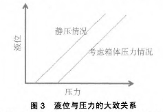 針對設(shè)備的故障,技術(shù)人員采取了更換多種質(zhì)量好的磁感應(yīng)開關(guān)(如耐高溫型等),以及基于磁翻板的外貼式模擬量液位控制,但效果均不理想。其他液位測量(如超聲波等)造價較高,而且需要對設(shè)備進行相應(yīng)的改造,并且停運一段時間,而該系統(tǒng)屬于公用,上述條件均無法滿足。既要實現(xiàn)自動控制,又要相應(yīng)允許實施。技術(shù)人員再次結(jié)合系統(tǒng)圖進行了分析:該水位溢流處和下限處范圍還是比較寬裕,而且箱體為非承壓容器,所以箱體內(nèi)的壓力和大氣壓相差不大,即便是有也基本上保持恒定,結(jié)合原水位測量的結(jié)構(gòu),考慮在帶報警開關(guān)磁翻板液位計的液位測量筒下部加裝1臺壓力變送器,在箱體壓力不是很大且基本恒定的情況下,液位與壓力值基本成對應(yīng)關(guān)系(只是在現(xiàn)場修正疊加一個常數(shù)值來消除箱體上不恒壓所帶來的偏差)。液位與壓力的關(guān)系曲線見圖3。