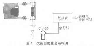 在外配1塊可輸出開關(guān)量接點的模擬量顯示儀表,這樣可實現(xiàn)液位的自動控制,集體的偏差多少可以在就實際進行整定試驗。整套測量系統(tǒng)的結(jié)構(gòu)圖見圖4。