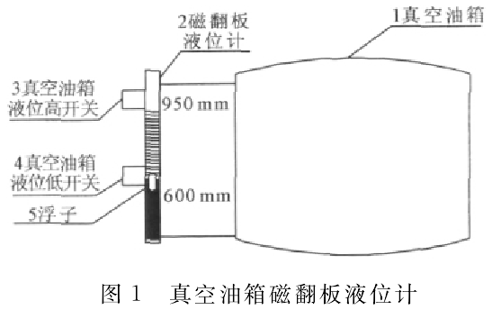 密封油真空油箱液位顯示采用防爆汽油罐液位計(jì),設(shè)置2個(gè)微動(dòng)開關(guān)(干簧管液位開關(guān))作為液位高低報(bào)警。微動(dòng)開關(guān)一個(gè)磁鐵安裝在一個(gè)干簧片上,浮子與磁鐵相互作用,磁鐵微微轉(zhuǎn)動(dòng)帶動(dòng)簧片的動(dòng)作,從而使液位開關(guān)的觸點(diǎn)斷開(或閉合),實(shí)現(xiàn)開關(guān)狀態(tài)的轉(zhuǎn)變。油位正常時(shí)磁翻板顯示油位為950mm。