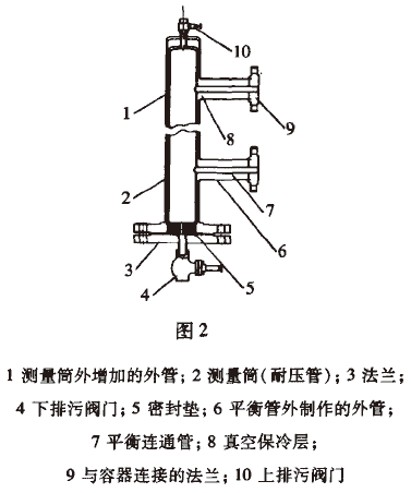 圖2加真空保溫層的磷酸儲(chǔ)罐液位計(jì)結(jié)構(gòu)示意1測量筒外增加的外管;2測量簡(耐壓管);3法蘭;4下排污閥門;5密封墊;6平衡管外制作的外管;7平衡連通管;8真空保冷層;9與容器連接的法蘭;10上排污閥門