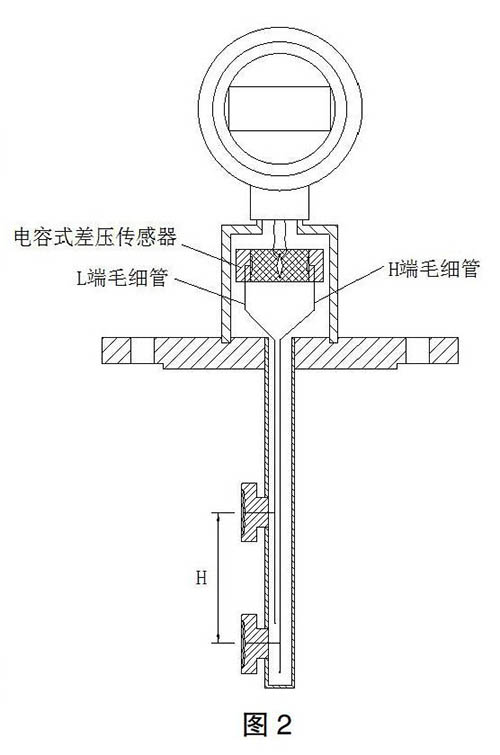 我們設(shè)想用差壓原理,將差壓高壓端(H端)做出充油的毛細(xì)管和受壓膜盒,毛細(xì)管加膜盒長度為從帶壓容器上的連接器到容器底部;差壓變送器低壓端(L端)也做一個膜盒,膜片直徑同高壓端的膜盒。這個膜盒置于上端的容器內(nèi),連接器下,也可以置于連接上邊的封閉腔室內(nèi),封閉腔室與連接器(法蘭)上有差壓傳感器低壓端引壓孔,與被測容器相連。用以自動減去容器內(nèi)壓力。為了使差壓變送器高低端由于真空下充灌硅油等導(dǎo)壓介質(zhì)對差壓造成的誤差盡可以少,將低壓端的毛細(xì)管做成與高壓端等長,毛細(xì)管下端封閉。這樣,雙向毛細(xì)管所產(chǎn)生的壓力幾乎相等,產(chǎn)生差壓幾乎為零。這樣設(shè)計還有另外一個重要功能,就是,無論充填什么樣的導(dǎo)壓介質(zhì),都要產(chǎn)生膨脹與收縮,只要有溫度變化,這種變化就有,由于雙向等長等容,兩個膜盒幾乎處于同一溫場,這種溫度變化產(chǎn)生的影響可以自動抵消,由充填導(dǎo)壓介質(zhì)產(chǎn)生的誤差很小。