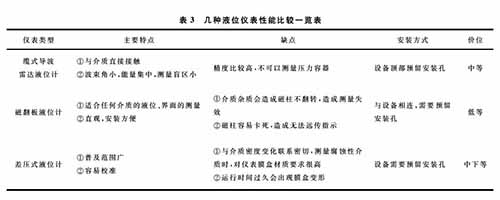 通過(guò)以上案例分析,幾種液位檢測(cè)儀表在液氨儲(chǔ)罐上的應(yīng)用各有不同的使用效果,現(xiàn)將其性能指標(biāo)歸納如下,供設(shè)計(jì)選型及儀表維護(hù)人員參考