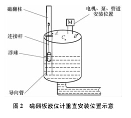 圖 2 中, B 點靠近電機和泵, 蒸餾水液位計安裝在此處既影響電機及泵的檢修, 又因泵附近液位的環(huán)流波動較大, 對浮子導(dǎo)向管沖刷嚴(yán)重, 故 B 點不合理; C 點處因有管道通過, 不便維護(hù)且影響管道和泵、 電機等的起吊更換, 故也不能選擇 C 點; A 點遠(yuǎn)離泵和電機, 且有足夠的空間安裝翻板, 便于維護(hù),所以 A 點較為合適。