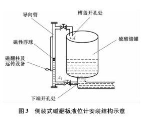側(cè)面安裝方式的關(guān)鍵點在于: ①酸槽內(nèi)壁襯有瓷磚, 故引流管上開孔應(yīng)選擇槽蓋合適位置, 下孔*好在進(jìn)口管上, 且均需加閥門, 便于維護(hù); ②考慮管內(nèi)硫酸在*端天氣時對磁翻柱及測量裝置的影響,因本公司循環(huán)槽溫度在75 ℃左右, 為避免夏天溫度過高影響傳感器測量, 冬天防凍, 管徑 D 應(yīng)在 80mm 以上可保證正常測量。