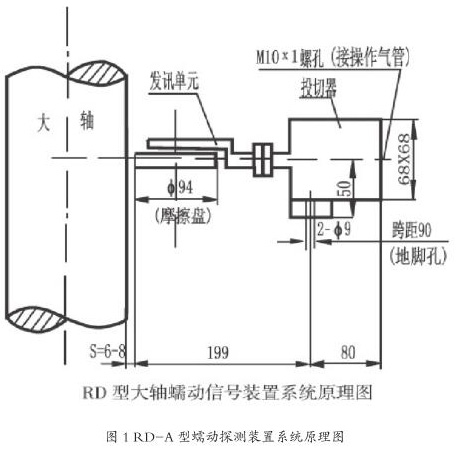 該電站蠕動(dòng)探測(cè)之前主要使用的是氣動(dòng)式機(jī)械蠕動(dòng)裝置和電動(dòng)式機(jī)械蠕動(dòng)裝置,哈電機(jī)組和 VHS 機(jī)組使用的是氣動(dòng)式蠕動(dòng)裝置,型號(hào)為 RD-A 哈控,RD-A 型蠕動(dòng)探測(cè)裝置由投切器和發(fā)訊單元兩部分組成,當(dāng)機(jī)組停機(jī)完成后通過(guò)蠕動(dòng)控制電磁閥(空氣電磁閥)向投切器通入壓縮空氣,它將發(fā)訊單元向前推進(jìn),使其磨擦盤(pán)與機(jī)組大軸表面相接觸(有稍許正壓力)。如果大軸發(fā)生蠕動(dòng),轉(zhuǎn)角達(dá)到 1.5° ~2°時(shí),發(fā)訊單元便發(fā)出大軸蠕動(dòng)信號(hào),作用于報(bào)警與制動(dòng)回路,投入制動(dòng)閘以防蠕動(dòng)現(xiàn)象擴(kuò)延。機(jī)組起動(dòng)前,先動(dòng)作空氣電磁閥使投切器排氣,由于彈簧力的作用,發(fā)訊單元退回原位。離開(kāi)大軸表面 6 mm~8 mm,確保裝置安全。RD-A型蠕動(dòng)探測(cè)裝置系統(tǒng)原理如圖1所示。RD-A型探測(cè)裝置易卡澀導(dǎo)致探測(cè)裝置投退失敗,影響開(kāi)停機(jī)成功率。東電機(jī)組使用的是電動(dòng)式蠕動(dòng)裝置,型號(hào)為 PXJ-1D。PXJ-1D 型蠕動(dòng)探測(cè)裝置多起反饋信號(hào)拒動(dòng)的事件,導(dǎo)致開(kāi)停機(jī)流程退出,其原因?yàn)殡妱?dòng)式蠕動(dòng)裝置控制回路與位置反饋節(jié)點(diǎn)取自同一個(gè)行程開(kāi)關(guān),當(dāng)行程開(kāi)關(guān)常閉節(jié)點(diǎn)斷開(kāi)時(shí),電機(jī)停止轉(zhuǎn)動(dòng),而此時(shí)可能因行程過(guò)短導(dǎo)致常開(kāi)節(jié)點(diǎn)尚未閉合,位置信號(hào)無(wú)法正常上送至監(jiān)控系統(tǒng)。為了解決這一問(wèn)題,目前電站 15 臺(tái)機(jī)組蠕動(dòng)探測(cè)裝置已換型為非接觸式蠕動(dòng)探測(cè)裝置,避免開(kāi)停機(jī)過(guò)程中投入或退出蠕動(dòng)失敗導(dǎo)致的流程退出。非接觸式蠕動(dòng)探測(cè)裝置設(shè)計(jì)原理為 :