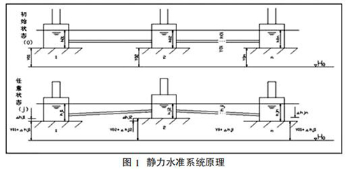 靜力水準(zhǔn)儀依據(jù)連通管的原理,采用振弦式傳感器,測量每個測點 容器內(nèi)液面的相對變化,再通過計算公式求得相對于基準(zhǔn)點的沉降量,如圖 1 所示。