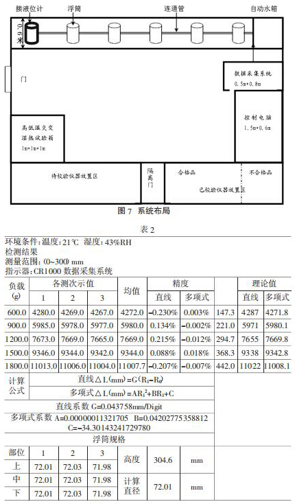 在本率定系統(tǒng)中,采用磁致伸縮式高精度真空夾套磁翻板液位計,精度為±0.01mm。采用高低溫交變濕熱試驗箱進行溫度傳感器率定。數(shù)據(jù)采集系統(tǒng)為美國坎貝爾 CR1000 自動數(shù)據(jù)采集系統(tǒng),通過控制電腦,將設(shè)定好的頻率裝載入采集系統(tǒng),自動加水和放水以及數(shù)據(jù)采集,同時數(shù)據(jù)自動保存和計算。