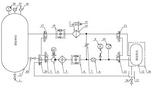 油液供油:原理中油液經(jīng)吸油開關(guān)(30)、L 形三通電動閥(3、29)、油泵(4)、加熱器(5)、供油過濾器(6)、流量計(8)、L 形三 通 電 動 閥(11)后進(jìn)入被測油箱,然后 經(jīng) L形三通電動閥(13)、油水換熱器(14)、回油過濾器(16)、L 形三通電動閥回到設(shè)備油箱中,此條支路可提供被測油箱剛安裝于試驗臺上時的油液供給,通過流量計軟件計時的方法判斷補油量。