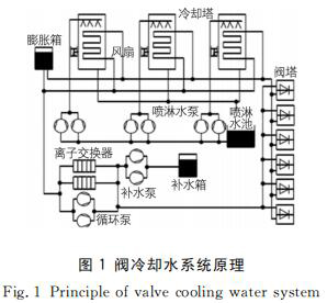閥冷卻水系統(tǒng)主要構(gòu)成部分為閥內(nèi)冷水系統(tǒng)與閥外冷水系統(tǒng)。閥內(nèi)冷水系統(tǒng)主要通過內(nèi)冷水與閥組件直接接觸流動,將襯四氟磁翻板液位計中熱量帶出,確保襯四氟磁翻板液位計組件中晶閘管、水冷電阻、陽*電抗器等發(fā)熱元件運行溫度具有可控性。而閥外冷水系統(tǒng)主要通過閉式冷卻塔或風(fēng)機將內(nèi)冷水中熱量帶走,并排放至環(huán)境中。襯四氟磁翻板液位計內(nèi)、外冷水系統(tǒng)的協(xié)同運行,可以使襯四氟磁翻板液位計組件內(nèi)部冷卻持續(xù)進行,并滿足元器件結(jié)溫要求,進而保證系統(tǒng)整體運行穩(wěn)定性、安全性。閥冷卻水系統(tǒng)原理如圖1所示。