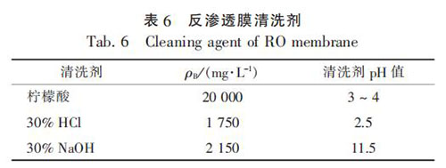 反滲透膜運(yùn)行一定時(shí)間后, 污染物會(huì)在膜表面沉積, 需要定期進(jìn)行化學(xué)清洗以完全恢復(fù)膜性能。 本系統(tǒng)設(shè)計(jì)清洗周期為 3 個(gè)月, 清洗包括循環(huán)、 浸泡、 沖洗 3 個(gè)過(guò)程, 將清洗劑引入反滲透膜 組 , 按 每 支 膜 11.4 L / min 的 流 量 循 環(huán) 5 ~ 15min, 再將單支膜流量調(diào)至 22.8 L / min 循環(huán) 5 ~ 15min, 然后再將單支膜流量調(diào)至 35 L / min 循環(huán) 30 ~60 min, 隨后進(jìn)入浸泡階段, 1 ~ 2 h 后進(jìn)行沖洗,直至濃水電導(dǎo)率與進(jìn)水電導(dǎo)率相同。 反滲透膜采用先酸洗后堿洗的步驟進(jìn)行, 酸洗和堿洗均經(jīng)過(guò)上述過(guò)程, 酸洗劑可選用檸檬酸或 HCl, 堿洗劑選用 NaOH。 清洗劑選擇見(jiàn)表 6。