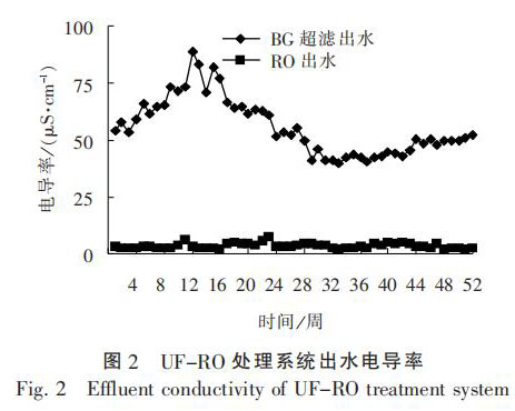 經(jīng)過(guò) 1 年的連續(xù)運(yùn)行, 晶背研磨廢水進(jìn)水 TOC質(zhì)量濃度為 0.5 ~ 5.0 mg / L, 濁度為 80 ~ 100 NTU,SiO2 質(zhì) 量 濃 度 為 2 ~ 4 mg / L, 反 洗 廢 水 進(jìn) 水 TOC質(zhì) 量 濃 度 為 1.5 ~ 3.0 mg / L, 濁 度 為 4 ~ 8 NTU,UF-RO 處理出水 TOC 質(zhì)量濃度低于 1 mg / L, 濁度低于 0.1 mg / L, SiO2 質(zhì) 量 濃 度 低 于 1 mg / L, 完 全可以回用至超純水預(yù)處理系統(tǒng)。 UF-RO 處理系統(tǒng)出水電導(dǎo)率和 TOC 濃度見(jiàn)圖 2 ~ 圖 3。