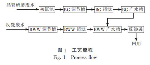 晶背研磨廢水在排放機(jī)臺附近設(shè)置簡易平流式沉淀池, 經(jīng)初沉后進(jìn)入調(diào)節(jié)槽, 經(jīng)過保安過濾器過濾后, 再進(jìn)超濾膜組, 產(chǎn)水流入產(chǎn)水槽; 反洗廢水進(jìn)入調(diào)節(jié)槽, 經(jīng)過保安過濾器過濾后, 再進(jìn)超濾膜組, 產(chǎn)水流入產(chǎn)水槽。 兩種超濾產(chǎn)水混合后, 經(jīng)保安過濾器, 進(jìn)入反滲透膜組, 產(chǎn)水回用至超純水預(yù)處理系統(tǒng), 濃水排放至廢水系統(tǒng)。