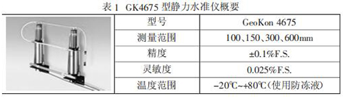 GeoKon 4675 型靜力水準儀是一種高精密液位系統(tǒng),該系統(tǒng)設(shè)計是 用于測量多點相對沉降的系統(tǒng)。在使用中,一系列的傳感器容器均采用PVC 液管聯(lián)接,每一容器的液位由一精密振弦式力傳感器測出,該傳感 器內(nèi)有一個自由懸重,一旦液位發(fā)生變化,懸重的懸應(yīng)浮力即被傳感器感,精確測出小至 0.025mm 的垂直變化。在多點系統(tǒng)中,所有傳感器的垂 直位移均是相對于其中的一點,該點的垂直位移是相對恒定的或者可用其它人工觀測手段準來確定。