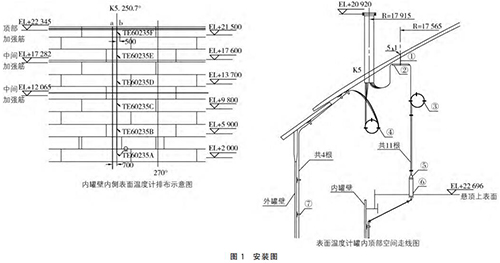 以昆侖能源華油天然氣四川廣安液化天然氣2萬方儲罐為例,在安裝多點(diǎn)溫度計(jì)過程中,內(nèi)罐底部溫度熱電阻需要從內(nèi)罐浮頂進(jìn)入罐內(nèi),沿罐壁垂直向下固定在罐底部。如需夾層底部溫度測量,則需要將溫度熱電阻沿外罐壁垂直而下,固定在罐底夾層的氮?dú)夤苌?,每間隔4m布置1個電纜固線器,如圖1所示。