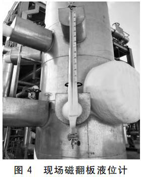 現(xiàn)場磁翻板液位計(jì)(圖4)由于儲罐壓力偏高,正常生產(chǎn)時為3MPa,導(dǎo)致磁翻版液位計(jì)浮子被壓扁。解決方法:尋找能夠生產(chǎn)耐高壓低密度液位計(jì)浮子廠家。