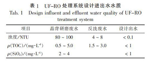 國(guó)內(nèi)某酸液液位計(jì)廠, 晶背研磨廢水產(chǎn)生量為 150 ~160 m3 / d, 反洗廢水產(chǎn)生量 為 500 ~ 700 m3 / d, 主要污染物為懸浮物, UF-RO 處理系統(tǒng)設(shè)計(jì)進(jìn)水和出水主要水質(zhì)指標(biāo)見(jiàn)表 1。
