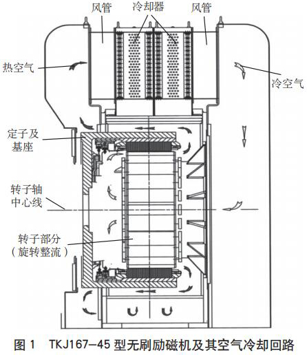 某核電廠的勵(lì)磁機(jī)采用ALSTOM生產(chǎn)的TKJ167-45 型無刷勵(lì)磁機(jī),該型號(hào)的勵(lì)磁機(jī)采用循環(huán)空氣冷卻,兩臺(tái)空氣冷卻器并排安裝在勵(lì)磁機(jī)的正上方,冷卻空氣在冷卻器、風(fēng)管以及勵(lì)磁機(jī)外罩連接形成的閉合風(fēng)路中進(jìn)行強(qiáng)迫循環(huán),具體情況如圖 1 所示。