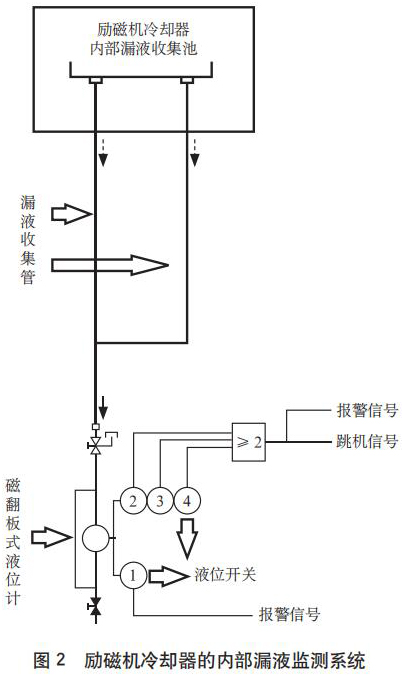實(shí)際運(yùn)行經(jīng)驗(yàn)表明,側(cè)裝式磁翻板液位計(jì)內(nèi)部銅管發(fā)生泄漏的概率較低,但一旦發(fā)生泄漏,漏液會(huì)隨著冷卻空氣沿閉合風(fēng)路進(jìn)入勵(lì)磁機(jī)內(nèi)部,造成勵(lì)磁機(jī)短路損壞的嚴(yán)重后果。為了保證機(jī)組安全,應(yīng)有冷卻器內(nèi)部銅管泄漏監(jiān)測裝置,然而現(xiàn)場沒有配置此類裝置。