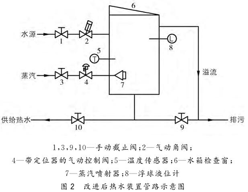 針對(duì)造成熱水裝置問題的原因,提出了以下改進(jìn)原則:為了改進(jìn)后水罐便于維修和保養(yǎng),確定把水罐改成水箱;為解決水溫分層以及設(shè)備震動(dòng),確定把環(huán)形加熱管更換為蒸汽噴射器;為解決液位檢測(cè)失效,確定把浮球磁翻板液位計(jì)更換為浮球液位計(jì);為解決水溫控制波動(dòng)大,把蒸汽進(jìn)汽角閥改為帶定位器的氣動(dòng)控制閥,以便調(diào)節(jié)蒸汽進(jìn)汽量。