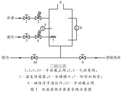 WQ39型葉絲超級(jí)回潮筒的熱水裝置于2004年4月投入生產(chǎn)使用,主要由水源、蒸汽源、角閥、手動(dòng)截止閥、環(huán)形加熱管、溫度傳感器和浮球磁翻板液位計(jì)等組成。改進(jìn)前熱水裝置管路示意圖如圖1所示。