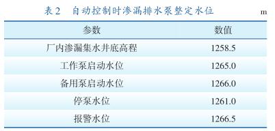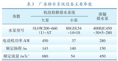 呼蓄電站廠房排水系統(tǒng)包括地下廠房滲漏排水系統(tǒng)、機(jī)組檢修排水系統(tǒng)。地下廠房滲漏排水系統(tǒng)設(shè)有1個(gè)滲漏集水井,有效容積364 m 3 ,設(shè)5臺(tái)滲漏排水泵,3運(yùn)2備,系統(tǒng)*大滲漏總排水量為2250m 3 /h。滲漏排水泵正常運(yùn)行時(shí)由廠內(nèi)滲漏排水控制盤PLC或監(jiān)控系統(tǒng)自動(dòng)控制啟停,也可就地通過每臺(tái)泵的啟動(dòng)柜手動(dòng)啟停。自動(dòng)控制時(shí)整定水位見表2。廠房排水系統(tǒng)設(shè)備主要參數(shù)見表3。