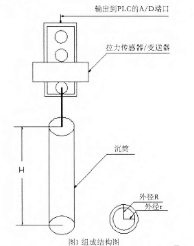 沉筒式液位計主要由拉力傳感器、變送器及沉筒組成,拉力傳感器內(nèi)部貼有電阻應(yīng)變片,通過信號線將變送器輸出的標準電流信號送到PLC的A/D輸入端口,用以進行數(shù)據(jù)處理和遠程控制。沉筒由上下兩端封閉的空心材料制成,并懸掛在拉力傳感器的受力端,其余部分投入到儲料罐中,拉力傳感器用法蘭盤或自帶螺紋固定在儲料罐的上方,結(jié)構(gòu)如圖1所示。