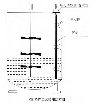在某些工業(yè)材料的制備過程中需要用到攪拌使材料混合均勻,達到工業(yè)用料的要求。即使液體始終處于攪拌狀態(tài)下,液體表面波動較大,罐體還有明顯的震動,再加上蒸汽、粉塵等比較惡劣的環(huán)境,傳統(tǒng)的液位檢測裝置無法正常工作。利用這種沉筒式液位計能很好的解決這一問題,并且能夠通過軟件去除誤差相對較大的數(shù)據(jù),保證檢測的精確性,其檢測結(jié)構(gòu)如圖2所示。