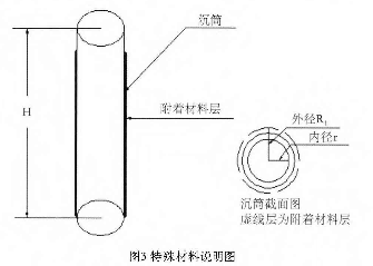 當材料本身有粘附性和凝固性時,沉筒的表明會附著一層或幾層材料,導(dǎo)致其體積發(fā)生變化,自身的重量也發(fā)生變化,其變化如圖3所示,其中沉筒截面積中虛線層為附著材料層,設(shè)此時沉筒外徑為R1。