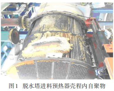 (1)脫水塔進(jìn)料熱交換器和塔頂冷凝器內(nèi)生成大量自聚物的主要原因是浮頭式換熱器結(jié)構(gòu)復(fù)雜,設(shè)備死角多;丁二烯走殼程,流速慢,會(huì)使丁二烯在高溫環(huán)境下停留過長(zhǎng),發(fā)生自由基聚合反應(yīng)。解決辦法是將 2 臺(tái)換熱器由浮頭式改為固定管板式換熱器,并將丁二烯含量較高的塔頂氣改為管程。一方面換熱器結(jié)構(gòu)較為簡(jiǎn)單無死角;另一方面走管程流速快,減少了丁二烯停留時(shí)間。