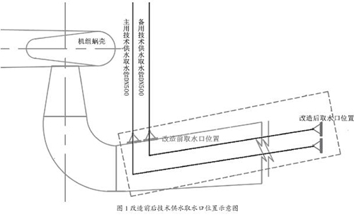 (3)對(duì)下游電站技術(shù)供水取水口進(jìn)行調(diào)整,將技術(shù)供水取水管向尾水管擴(kuò)散段側(cè)面下游方向延伸 33 m,將取水口升高 3 m,并在取水口加裝過(guò)濾網(wǎng),以過(guò)濾較大的砂石、木塊等,減少對(duì)磁翻板液位計(jì)、濾水器等的沖擊磨損和堵塞。改造前后的技術(shù)供水取水口示意圖如圖 1 所示。