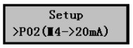 1)在儀表正常工作時(shí)按擊Mode鍵進(jìn)入?yún)?shù)設(shè)置菜單后按擊▼鍵選擇P02(4~20mA)設(shè)置菜單,如右圖。