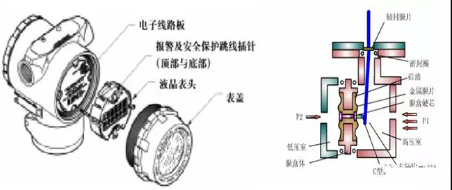 鍋爐差壓式液位計結(jié)構(gòu):主要部件為傳感器模塊、電子元件外殼、毛細(xì)管、高低壓側(cè)法蘭及膜片。傳感器模塊包括充油傳感器系統(tǒng)(隔離膜、充油系統(tǒng)和傳感器)以及傳感器電子元件。