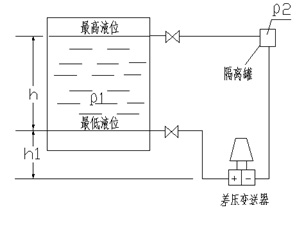 壓力式液位計(jì)采用靜壓測(cè)量原理,當(dāng)液位變送器投入到被測(cè)液體中某一深度時(shí),傳感器迎液面受到的壓力的同時(shí),通過導(dǎo)氣不銹鋼將液體的壓力引入到傳感器的正壓腔,再將液面上的大氣壓 Po 與傳感器的負(fù)壓腔相連,以抵消傳感器背面的 Po ,使傳感器測(cè)得壓力為:ρ.g.H ,通過測(cè)取壓力 P,可以得到液位深度。