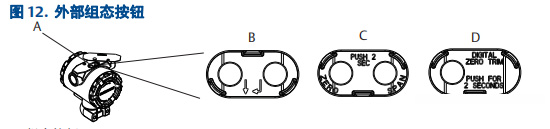 使用位于頂部銘*下、三組可能的外部組態(tài)按鈕中某一組進(jìn)行零點(diǎn)調(diào)校。為了操作組態(tài)按鈕,需要松開螺釘,滑動(dòng)變送器頂部的銘*。參照圖 10 來確認(rèn)功能。
