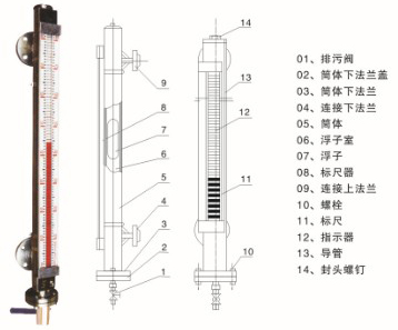 磁翻板液位計的結(jié)構(gòu)原理如圖,本體是一根連通管體,通過法蘭與用戶容器連接,連通管體內(nèi)有一磁性浮子,隨著液位的升降而升降。管體外面固定由翻柱組成的指示器,翻柱由紅白兩色組成,液拉未上升前為白色,當(dāng)液位上升磁性浮子跟隨上升,并通過磁耦合帶動翻柱轉(zhuǎn)動180度,翻成紅成紅色來指示液位,紅、白界位即容器內(nèi)的液位高度。