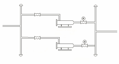 在輸氣站場(chǎng)根據(jù)下游用戶年設(shè)計(jì)輸氣量及檢維修需求通常設(shè)置兩臺(tái)臥式過(guò)濾分離器,運(yùn)行時(shí)通常采用一用一備方式運(yùn)行,氣量需求高峰時(shí)段達(dá)到單臺(tái)處理量時(shí)兩臺(tái)同時(shí)運(yùn)行以滿足用戶氣量需求。過(guò)濾分離器在整個(gè)輸氣站場(chǎng)工藝流程中通過(guò)法蘭與管道相連,同時(shí)上下游均設(shè)置球閥(見(jiàn)圖1),其中下游球閥與電動(dòng)執(zhí)行機(jī)構(gòu)相匹配使用,能實(shí)現(xiàn)遠(yuǎn)程開(kāi)關(guān)控制。在正常運(yùn)行狀態(tài)下,在用過(guò)濾分離支路的上下游球閥處于完全開(kāi)啟狀態(tài),備用過(guò)濾分離支路的上游球閥處于開(kāi)啟狀態(tài),下游球閥處于關(guān)閉狀態(tài)。對(duì)于過(guò)濾分離器切換有兩種方式:一種是手動(dòng)模式,另一種是自動(dòng)模式。在手動(dòng)模式下可由操作人員通過(guò)遠(yuǎn)程和就地狀態(tài)下實(shí)現(xiàn)過(guò)濾支路流程切換;當(dāng)在自動(dòng)模式下電動(dòng)閥產(chǎn)生事故關(guān)斷時(shí),則報(bào)警并自動(dòng)選擇備用設(shè)備,打開(kāi)備用支路的電動(dòng)閥,關(guān)閉當(dāng)前支路的電動(dòng)閥門(mén),實(shí)現(xiàn)工作分離器和備用分離器的切換,上述過(guò)程由程序自動(dòng)完成,不需人為干預(yù)。